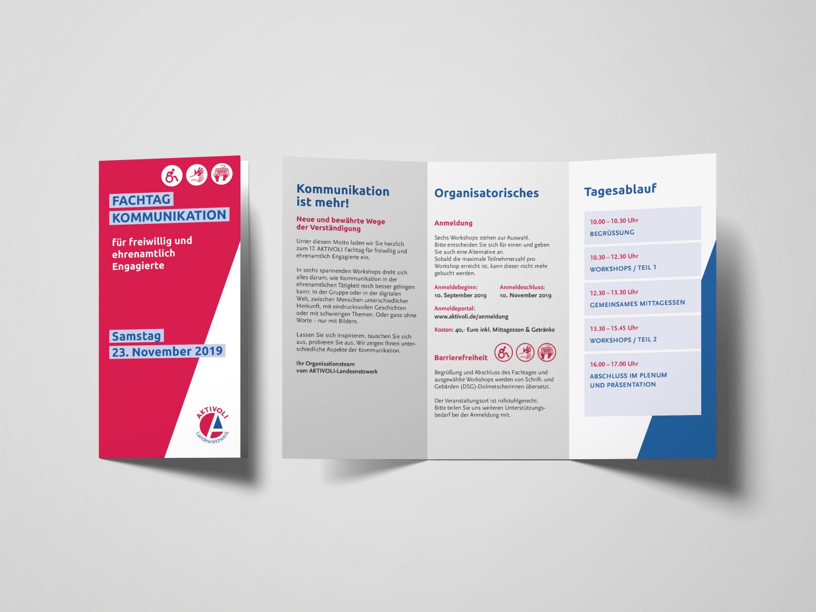 Dieses grundlegende Design fand Anwendung in einer kleinen quadratischen Broschüre sowie in einem Faltblatt zum „Fachtag Kommunikation“.