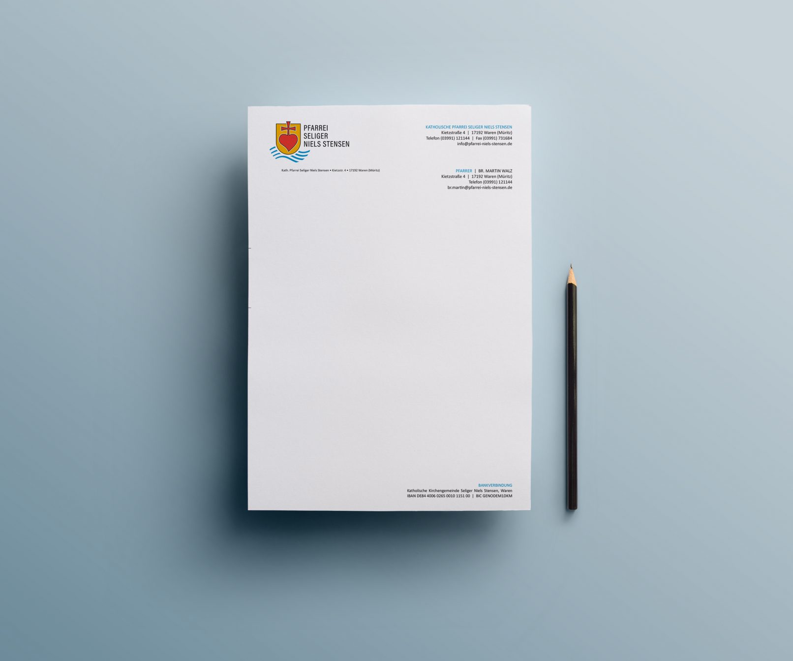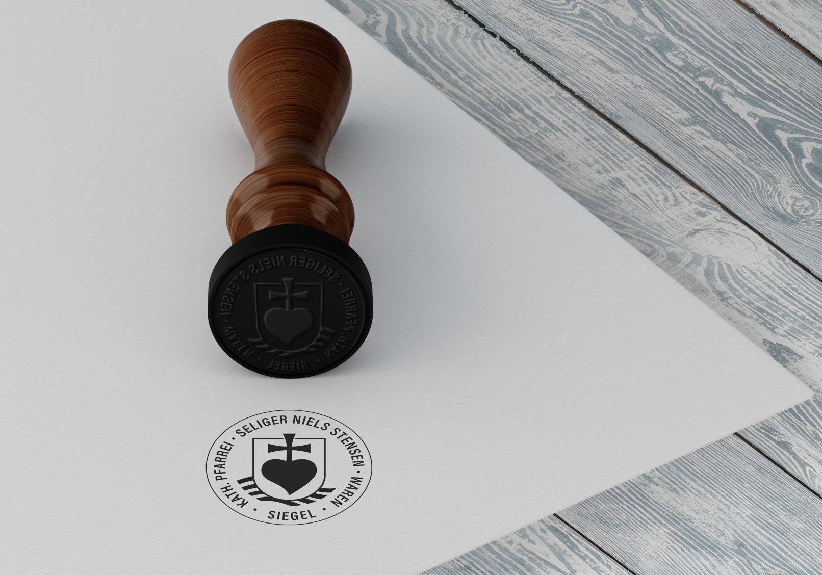 Die am 8. März 2020 neu gegründete katholische Pfarrei „Seliger Niels Stensen“ benötigte ein Logo, das auf dem Wappen des Niels Stensen aufbaute, einen Siegel-Stempel und die Gestaltung des Briefpapiers.